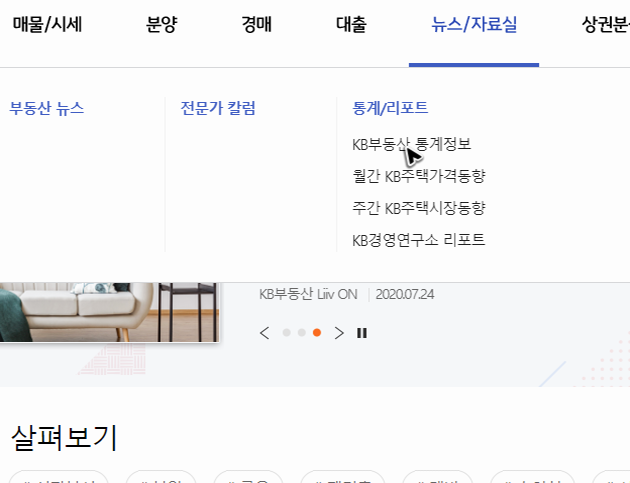 참고로 제가 적어둔 주소는 리브온이 아니라 kb국민은행으로 이동하는 주소입니다. 그래서 제가 적어둔 주소를 클릭하거나 브라우저에 입력해서 페이지 이동을 하셨다면, 상단에 정리된 카테고리 메뉴에서 부동산이라 적힌 메뉴를 한 번 더 눌러주셔야 해요. 정확한 클릭 위치는 아래쪽 그림에서 커서가 있는 곳을 확인해보시면 될 것 같습니다.