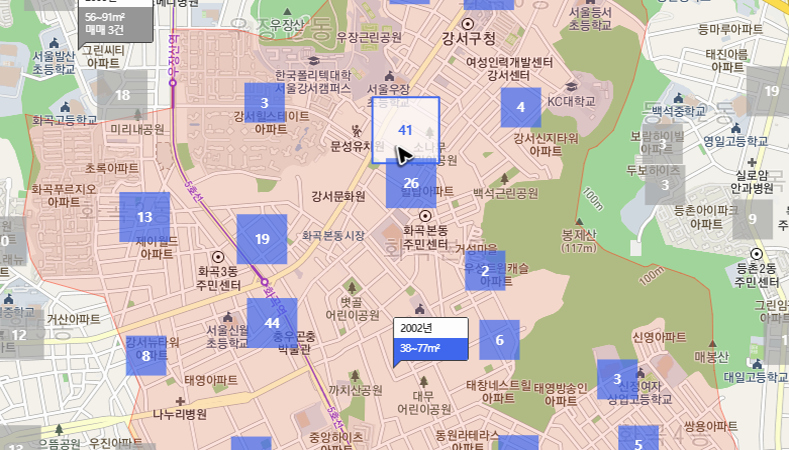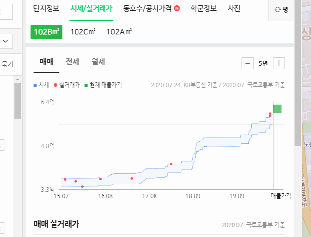 혹시 지도 위에서 바로 시세가 보이지 않는다면, 마우스 휠을 굴리면서 지도를 적당히 확대해주세요. 그럼 데이터가 보이기 시작할 거예요. 그리고 보다 상세한 정보들을 열람하고 싶으시다면, 관심을 두는 위치와 항목에 마우스 커서를 올려주세요. 그럼 작은 화면이 열리는데, 여기에서 실거래가를 클릭하면 됩니다.
