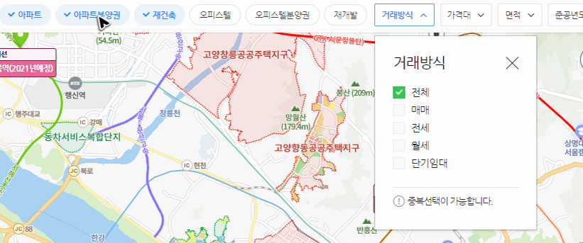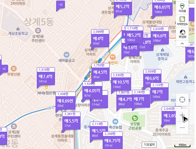역시나 이번에도 큰 지도가 있는 곳으로 이동이 됩니다. 그리고 지도 위쪽에는 세부 검색 항목들이 정리되어 있어요. 먼저 찾아간 곳보다 세부 검색 항목이 조금 더 상세한 느낌인데, 항목을 하나씩 살펴보면서 적당히 수정을 해주시면 될 것 같습니다. 그리고 지도에 있는 시세를 확인하면 됩니다.