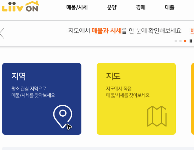 공식 사이트를 방문하면 중간에 지역이라 적힌 버튼과 지도라 적힌 버튼이 보일 거예요. 해당 버튼을 클릭해서 관심을 두고 있는 부동산의 위치를 검색해주시면 됩니다. 저는 파란색으로 된 버튼을 눌러서 임의로 위치를 지정해보도록 할게요.
