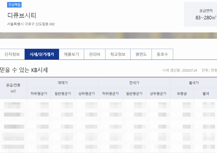 버튼을 클릭하면 한 번 더 다른 페이지로 이동될 거예요. 그리고 이동한 페이지 아래쪽을 보면 표로 정리된 시세가 있습니다. 어떤 부동산을 선택하느냐에 따라 데이터가 없을 수도 있는데, 이럴 땐 국토부나 네이버 등 다른 사이트에서 확인을 해봐야 해요. 좌우간, 이렇게 kb부동산 리브온을 활용해서 아파트나 오피스텔, 빌라 등의 시세를 확인하면 됩니다.