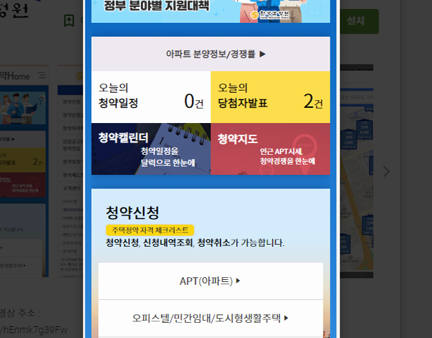 그리고 청약홈의 경우 컴퓨터에서 사이트를 찾아갈 수 있지만, 스마트기기에 어플을 설치해서 찾아갈 수도 있습니다. 여느 앱과 마찬가지로 플레이스토어를 실행하고 검색하면 앱을 확인하실 수 있을 거예요. 설치 방법 역시 보통의 어플과 동일하며, 사용법은 홈페이지와 동일합니다. 메뉴의 크기와 구성만 조금 다를 뿐 어플이나 홈페이지나 완전히 동일해요.