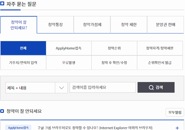 혹시 아파트 청약사이트를 통해서 과정을 연습해보는데 용어가 어려워서 막힘이 있다거나, 오류가 있다거나, 요구하는 정보의 의미를 모르겠다면, 첫 화면으로 돌아와서 용어설명이나 자주 묻는 질문을 클릭해보면 됩니다. 사이트를 이용할 때 생길 수 있는 대부분의 궁금증이 정리되어 있기 때문에 여기를 둘러보시면 복잡해서 막히는 부분을 무난하게 뚫을(?) 수 있으실 거예요.