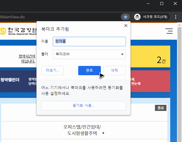 여담으로 청약홈이 됐든, 정보를 얻는 다른 루트가 됐든, 한 번 방문을 하면 재방문을 해야 하기 마련이예요. 그러니 기왕 찾은 김에 브라우저 북마크에 추가해두는 것을 권장합니다. 브라우저 북마크에 추가하는 방법은 주소창 오른쪽에 있는 별표를 누르면 됩니다.