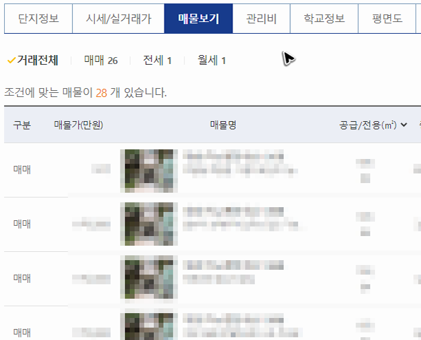 좌우간, 목록을 살펴보면 각각의 항목 바로 아래쪽에 KB시세, 실거래가 보기라 적힌 메뉴가 보일 거예요. 그 버튼을 누르면 시세가 있는 상세 페이지로 이동될 것입니다.