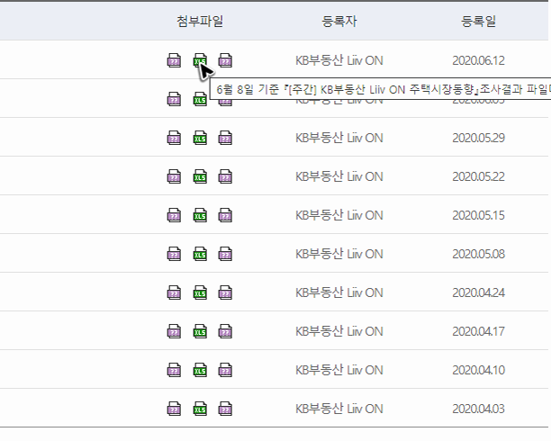 카테고리 메뉴를 누른 뒤에는 기준지역을 설정하고 조회 버튼을 누르면 됩니다. 그럼 여러 종류의 통계 자료가 나오는 것을 확인하실 수 있을 거예요. 혹시 엑셀 파일로 정리된 자료를 따로 확인해보고 싶으시다면, 주간 KB주택시장 동향 자료 더보기 버튼을 눌러주세요. 그럼 또 다른 페이지로 연결이 되는데, 항목 우측에 있는 엑셀 모양의 아이콘을 누르면 됩니다.