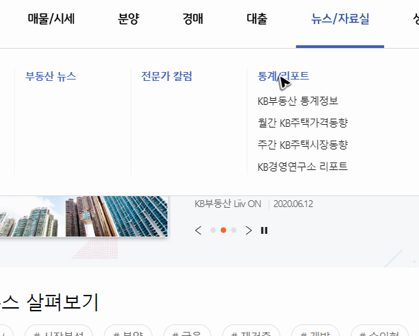 저는 kb를 통해서 관심을 두고 있는 동네의 추이를 살펴보는 경우가 많습니다. 혹시 저처럼 전반적인 흐름을 알아보고 싶으시다면, 상단의 뉴스 및 자료실이라 적힌 메뉴에 커서를 올리고, 드롭되는 메뉴에서 통계 및 리포트를 클릭해주세요.
