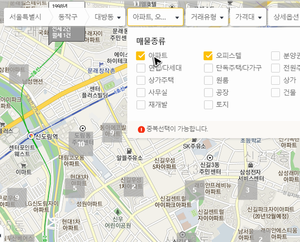 위치를 검색하면 지도가 있는 페이지로 연결이 될 거예요. 지도에서 위치가 정확하게 선택된 것이 맞는지 살펴보고, 지도 위에 있는 숫자 버튼을 눌러주세요. 그럼 화면 왼쪽에 선택한 숫자에 해당하는 건축물 목록이 나올 것입니다. 혹시 아파트나 오피스텔 등, 특정 유형만 확인하고 싶다면 상단의 검색 값을 수정해주시면 됩니다.