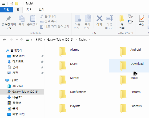 저처럼 컴퓨터로 자료실을 찾아가서 구글플레이스토어나 다른 앱의 apk를 받으셨다면, 어플을 설치해야 할 기기를 PC와 연결해주세요. 그리고 탐색기를 열어서 연결한 기기의 드라이브로 진입해주세요. 그럼 여러 종류의 폴더가 보이는데, 아무런 폴더를 선택해도 되지만, Download라 적힌 폴더를 열어주는 것이 제일 깔끔합니다.