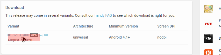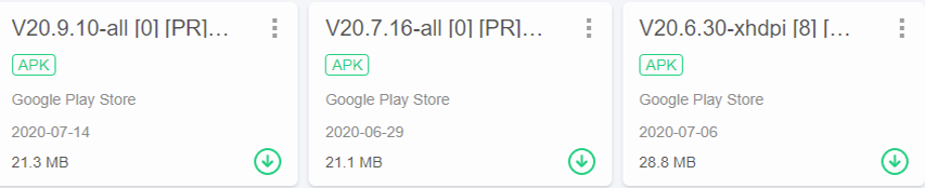 다만, 초록색 버튼은 가장 최근에 공개된 구글플레이스토어를 받는 버튼입니다. 그런데 google play store의 업데이트 오류로 인해서 apk 파일을 구하는 것이라면 구버전을 찾고 있으실 거예요. 이럴 땐 초록색 버튼 바로 오른쪽에 있는 버전이라 적힌 버튼을 누르고 필요한 구버전을 찾아서 클릭을 해주시면 됩니다.