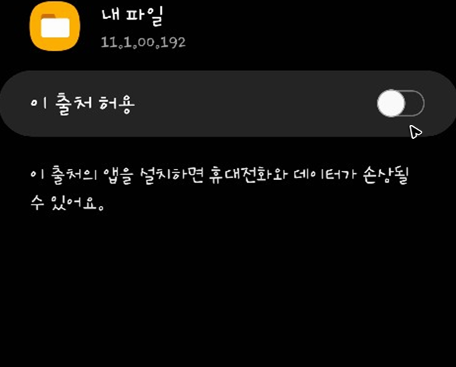 따로 자료실을 통해서 받은 파일이기 때문에 출처와 관련된 물음이 나올 거예요. 우리는 안전한 자료실을 통해서 파일을 받은 것이기 때문에 그냥 실행해주면 됩니다. 설정 메뉴를 누르고 사용 설정을 켜주시면 됩니다. 그리고 apk를 탭해서 실행해주세요. 그럼 나머지 설치 과정은 자동으로 진행될 것입니다.