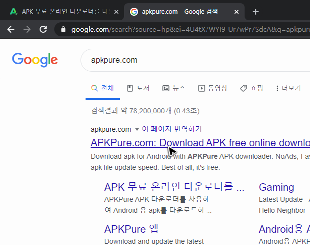 검색해보면 의외로 apk를 받을 수 있는 사이트가 정말 다양해요. 하지만 모든 사이트를 알아둘 필요는 없습니다. 어떤 사이트는 검증되지 않은 파일이 올라오기도 하는데, 이런 자료실은 최대한 거르는 것이 좋겠죠. 가장 안전하게 사용할 수 있는 자료실 하나만 알아두면 충분합니다. 그런 의미에서 [apkpure.com]를 통해서 구글플레이스토어를 다운로드하고 앱을 준비하는 것을 권장합니다.