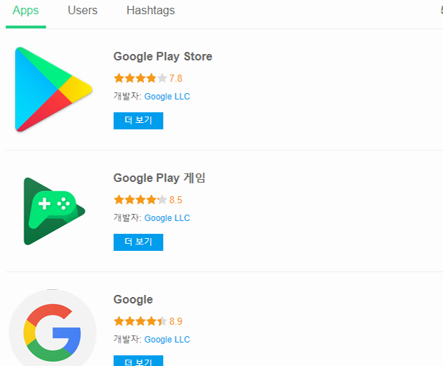 적당한 단어를 입력하고 검색하면 관련된 여러 종류의 어플이 목록으로 나올 거예요. 여기에서 찾고 있었던 어플의 더 보기 버튼을 클릭하면 됩니다. 저는 가장 위쪽에 있는 항목의 더 보기 버튼을 눌러서 페이지 이동을 해볼게요.