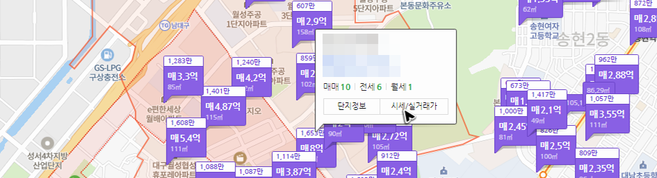 큰 지도가 있는 화면으로 연결이 되었다면, 처음 찾아간 곳과 마찬가지로 이번에도 지도 위쪽에 있는 상세 검색 옵션을 확인하면 됩니다. 값을 적당히 수정해주세요. 그럼 지도 위에 해당하는 위치가 로딩이 되고 시세가 바로 보일 것입니다. 조금 더 상세한 아파트의 정보를 확인하고 싶다면, 관심을 두는 단지에 커서를 올려주세요. 그럼 추가 화면이 로딩되는데, 여기에서 실거래가를 클릭하면 됩니다.