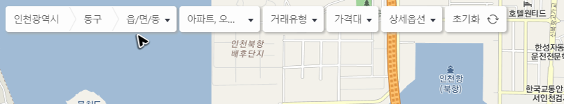큰 지도가 있는 화면으로 전환되었다면, 지도 왼쪽 상단부터 확인을 해주세요. 그럼 상세 검색을 위한 도구가 보이는데, 여기에서 부동산을 선별하기 위한 검색값을 다시 한 번 지정해주시면 됩니다. 그리고 이제 검색한 위치에서 지도 위에 있는 숫자를 눌러주세요.