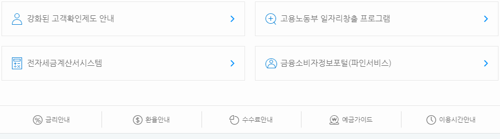 위에 적어둔 주소는 인터넷뱅킹의 전용 페이지가 아닙니다. 그래도 중간에 보면 간단한 조회와 이체 메뉴가 보여요. 이 부분을 클릭하시고 업무를 처리하시면 됩니다. 혹시 조금 더 많은 온라인 뱅킹 서비스를 확인하고 싶으시다면, 사이트 상단 영역에서 메뉴를 눌러주시면 됩니다.