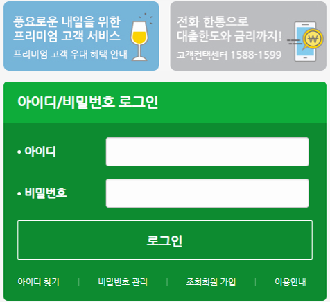 상단 카테고리 메뉴를 클릭하면 로그인하는 화면으로 연결이 될 거예요. 여기에서 로그인을 해주셔야 온라인 은행 서비스를 이용할 수 있습니다. 그리고 사전에 온라인으로 금융 업무를 처리하기 위한 서비스에 등록을 해주셔야 하는데, 혹시 이번에 처음으로 이용하는 것이고, 따로 신청한 적이 없으시다면, 번거로우시더라도 창구를 찾아가셔서 미리 신청을 해주셔야 해요.