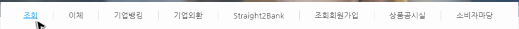 위에 적어둔 주소는 인터넷뱅킹의 전용 페이지가 아닙니다. 그래도 중간에 보면 간단한 조회와 이체 메뉴가 보여요. 이 부분을 클릭하시고 업무를 처리하시면 됩니다. 혹시 조금 더 많은 온라인 뱅킹 서비스를 확인하고 싶으시다면, 사이트 상단 영역에서 메뉴를 눌러주시면 됩니다.