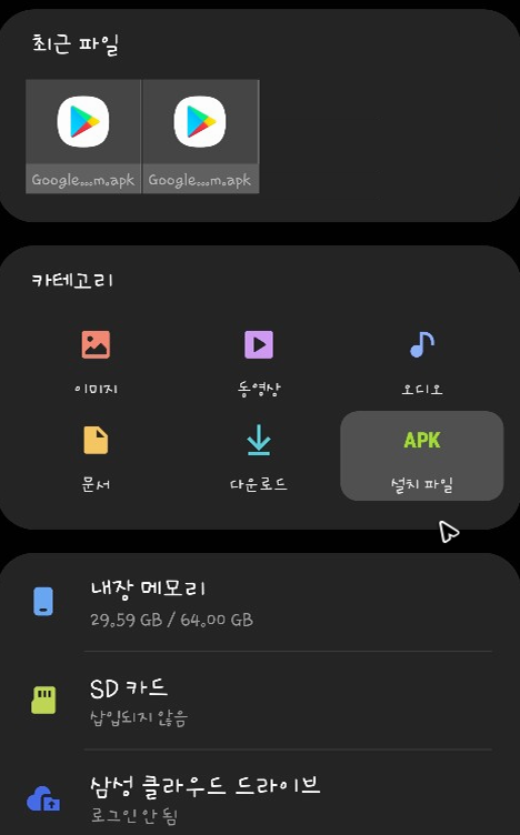 이렇게 기기로 파일을 옮긴 뒤에는 USB를 분리하고 기기의 화면을 열어주세요. 그리고 내 파일과 같은 파일 관리 앱을 찾아서 실행해주세요. 그럼 방금 추가해둔 apk 파일이 목록에 있을 것입니다. 혹시 목록에서 구글 store apk를 확인할 수 없다면 설치 파일이라 적힌 메뉴를 탭해주세요. 그리고 파일을 열어주시면 됩니다.