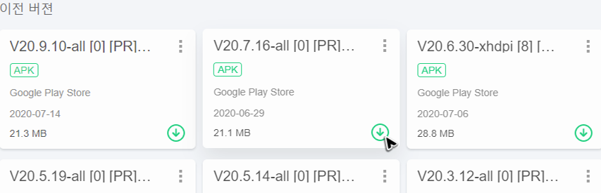 이렇게 자료실에서 필요한 apk를 검색하며 상세 페이지로 이동했다면, 초록색의 다운로드 버튼이 바로 보일 거예요. 물론 클릭하면 됩니다. 초록색 버튼을 누르면 업데이트가 필요하지 않은 최신 버전의 마켓이 받아질 거예요. 그런데 혹시 특별히 찾고 있으신 버전이 있으시다면, 다운로드 바로 옆에 있는 버전을 누르면 됩니다. 그럼 구버전 목록을 확인할 수 있는데, 여기에서 필요한 버전을 찾고 받아주세요.