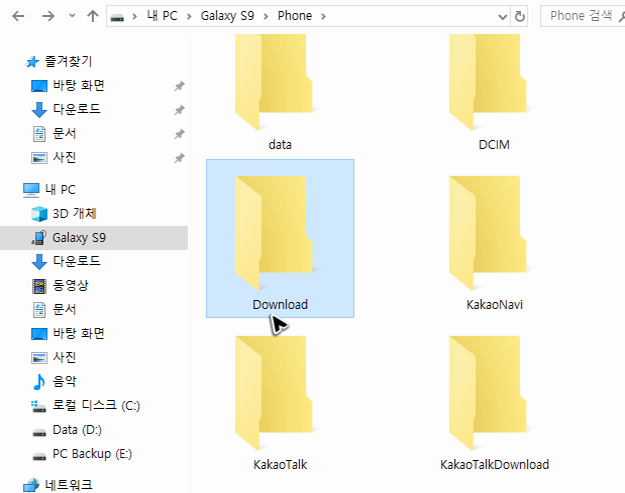 탐색기를 열고 기기 드라이브로 진입한 뒤에는 적당한 폴더를 선택해서 구글의 파일을 넣어주시면 됩니다. 드라이브 안에는 여러 종류의 폴더가 있고, 왠지 아무런 폴더를 쓰면 안될 것 같은 느낌도 있습니다. 그러니 Download라는 이름의 폴더를 찾고 그 안에 자료실에서 받은 파일을 추가해주세요. 역시 다운로드 폴더를 쓰는 게 가장 무난한 것 같아요.