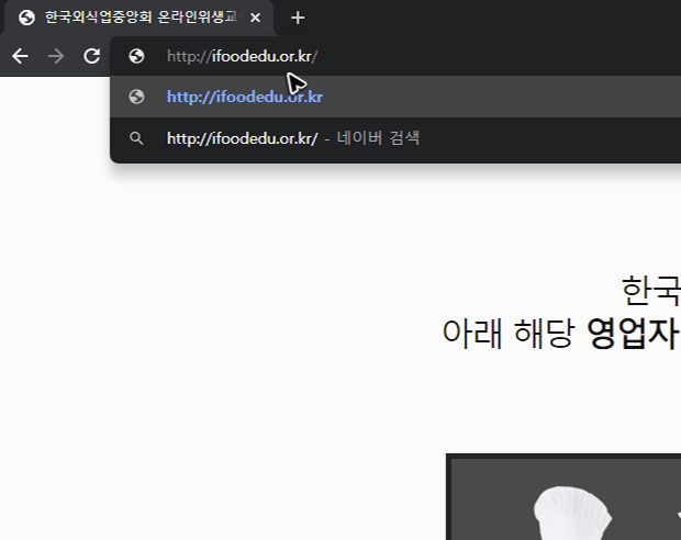 법정의무교육에 해당하는 과정이고, 해당 과정을 수료할 수 있도록 해주는 사이트는 전혀 비밀스럽지 않습니다. 고로 포털에서 대충 검색해도 공식 사이트를 찾을 수 있어요. 다만, 검색하는 것 자체가 조금 귀찮은 부분이죠? 그러니 실행해둔 브라우저의 주소창에 [ifoodedu.or.kr]를 입력해서 한국외식업중앙회의 온라인교육과 위생 강좌가 있는 곳으로 이동해주세요.