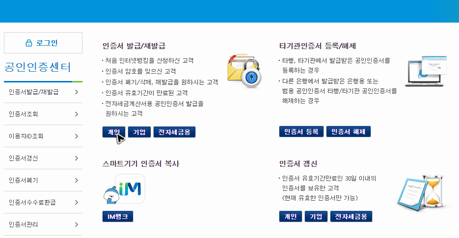 여담으로 하마 대구은행 한 곳만 이용하시는 분들은 없으실 거예요. 국민이 됐든, 우리가 됐든, 다양한 은행을 이용하고 있으실 텐데, 한 곳에서 공인인증서를 만들었다면, 해당 파일을 다른 은행에 그대로 등록해서 쓰면 됩니다. 굳이 공인인증서를 여러 개 만들 필요가 없어요. 이렇게 타행 인증서 등록을 하는 것 역시 이용하려는 온라인 은행의 공인인증센터를 찾아간 뒤에 타행 인증서 등록 메뉴를 찾아서 클릭하고, 요구하는 정보들을 채우면 됩니다.