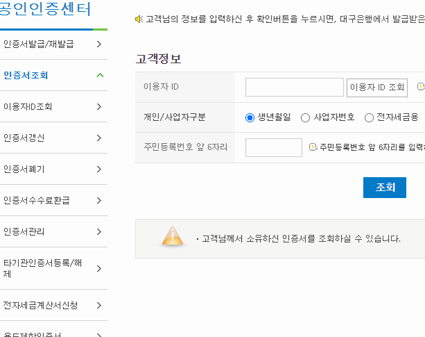 위에 적어둔 주소는 공인인증서를 관리하는 페이지가 아니라 대구은행의 온라인 뱅킹 사이트이기 때문에 메뉴를 한 번 눌러주셔야 해요. 우측 상단을 보면 공인인증센터라 적힌 버튼이 있으니, 그 버튼을 클릭해서 상세 페이지로 이동해주세요.