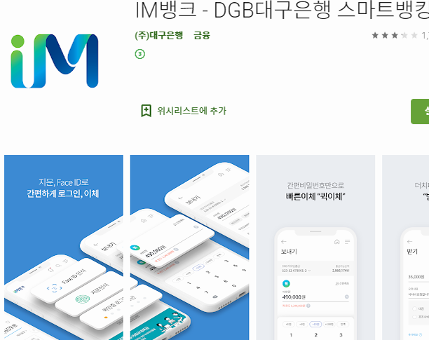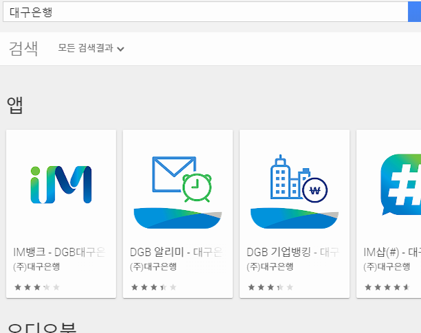 플레이스토어를 열고 대구은행을 검색해보면 몇 가지의 앱이 나오는데, 이 중에서 첫 번째에 있는 IM뱅크 - DGB대구은행 스마트뱅킹을 선택해서 설치하면 PC와 동일하게 금융업무를 처리할 수 있습니다.