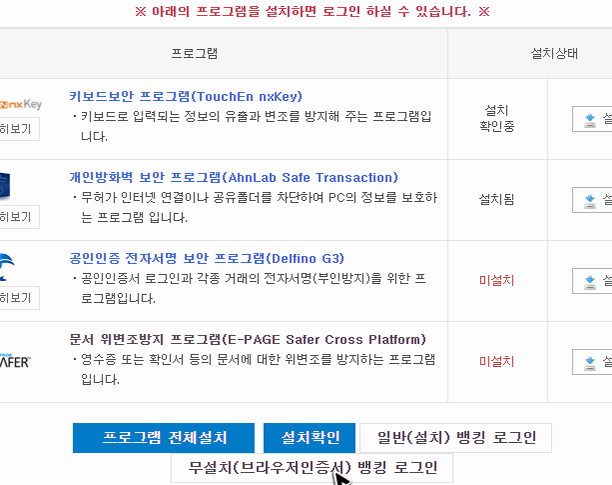그렇다고 필수는 아니예요. 사용자가 직접 선택할 수 있도록 선택권을 주고 있는데, 혹시 모듈이 없어서 이용하는데 거리낌이 없다면, 안내되고 있는 화면의 가장 아래쪽에 있는 비설치 메뉴를 누르면 됩니다. 물론 안전한 거래를 위해서 모듈을 설치한 뒤에 대구은행을 이용하셔도 괜찮아요. 다만, 모듈을 설치한다면 사용한 뒤에는 삭제해서 리소스를 잡아먹지 않도록 해주는 것이 좋습니다.