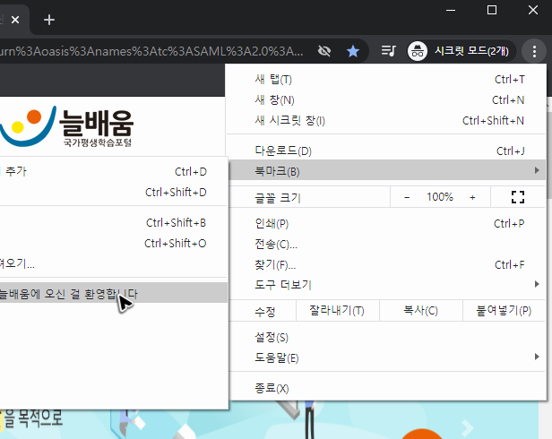 사용하는 브라우저 종류에 따라 북마크 목록을 불러오는 방법이 조금씩 다를 수 있는데, 일반적으로 별표 버튼을 한 번 더 클릭하면 목록이 나옵니다. 저처럼 크롬을 사용하신다면, 우측 상단 설정 메뉴를 누르거나 [Ctrl + Shift + B]를 눌러서 목록을 불러오고, 목록 중에 있는 늘배움을 클릭하면 빠르게 국가평생학습포털의 강좌가 있는 곳으로 이동할 수 있습니다.